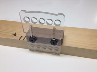 workpieces (an imaginary side and bottom), a 1/4" drill guide,