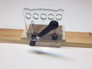 acrylic template with a single drill "bushing" mounted in a